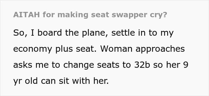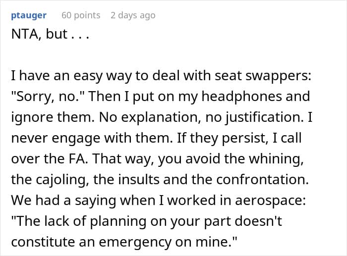 But apparently, you don’t have to sit next to an actual child to be in close proximity to a tantrum. Below, you’ll find a story that one traveler recently shared on Reddit after they refused to swap seats with an entitled mother’s son on a flight, as well as a conversation with airline pilot and bestselling author, Patrick Smith.