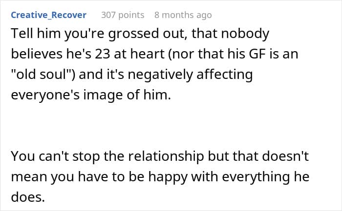 While the poster and her mom were both concerned about this, nothing could prepare them for what happened a month ago. He told them that he was in a relationship and showed them a picture of his new girlfriend who, shockingly, turned out to be a 23-year-old girl, a year younger than even the poster!