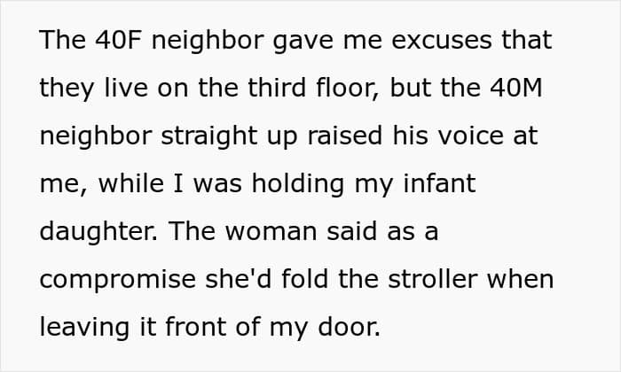 Someday, I’ll tell you that story—really worthy of being immortalized on the pages of We—but today, we have another tale from the user u/carplast, whose neighbors were lazy enough to not carry their toddler’s stroller up literally two flights of stairs. And also entitled enough to take her report personally. But let’s not get ahead of ourselves.