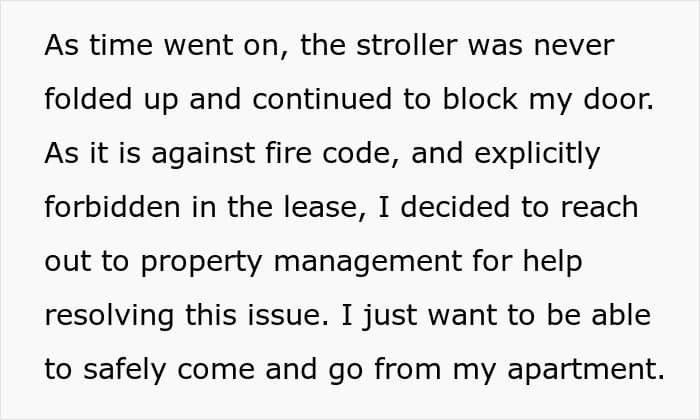 This story took place recently, when the Original Poster (OP), a 32-year-old mom, moved into a new apartment on the ground floor of a 3-story building. A couple in their 40s with a toddler son live on the floor above, and they have taken to leaving their baby stroller right in front of our heroine’s door, thus literally blocking it.
