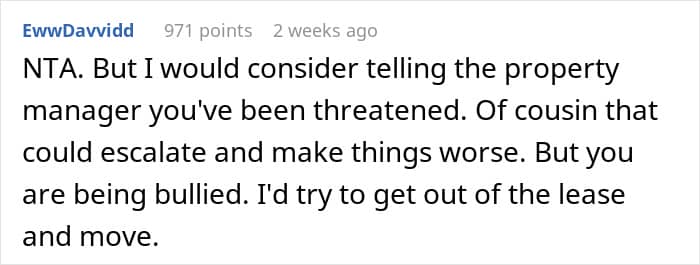 In any case, many responders also urged the author to notify the homeowner about the threats, too. “Consider reporting them again to building management for the confrontation,” someone wisely wrote. “This kind of behavior was completely uncalled for.” And what would you, our dear readers, do in the described situation? Please feel free to share your ideas in the comments below.