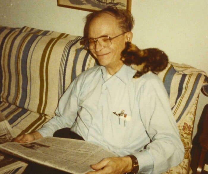 #13 My Grandpa Trying To Read The Newspaper With A Kitten Sitting On His Shoulder. Early 1980s