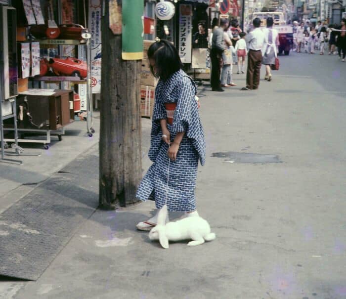 #21 A Girl Walking Her Rabbit In A Summer Kimono. Shinagawa, Japan, 1973