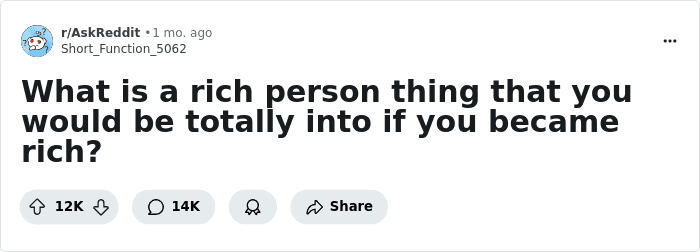 A few weeks ago, a thread appeared in the AskReddit community, where the topic starter asked netizens: “What is a rich person thing that you would be totally into if you became rich?” Today, the thread already has over 12K upvotes, and even more – 13K – various comments. People are very active in sharing and discussing dreams with – let’s face it – a very low probability of coming true. On the other hand – why not dream?