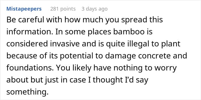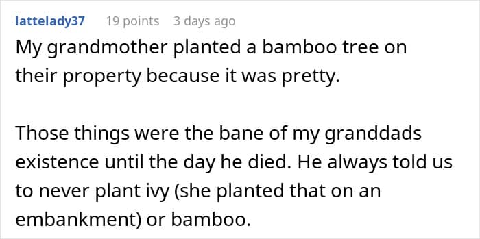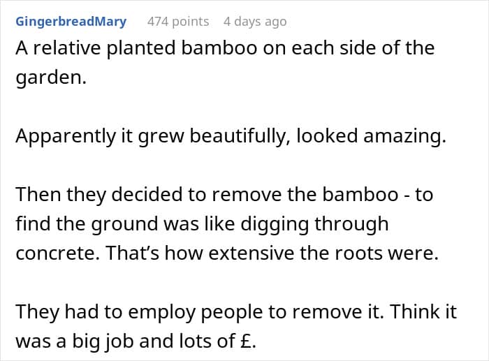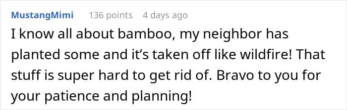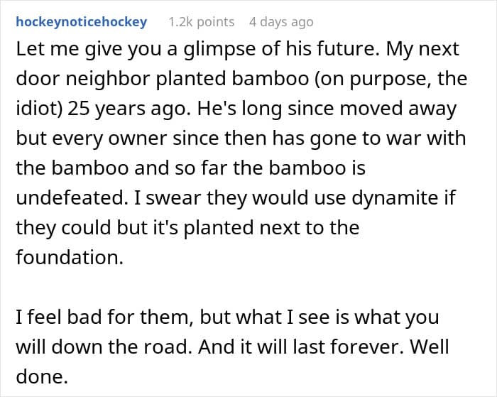 Another commenter, whose neighbor did this on purpose 25 years ago, seemingly thinking it’s gonna be great, elaborated on the future. The neighbor moved away, but every other person living there has declared war on the bamboo at some point in their existence there and the bamboo still sits undefeated. It will surely last forever.