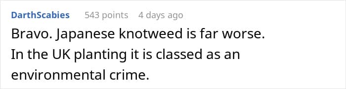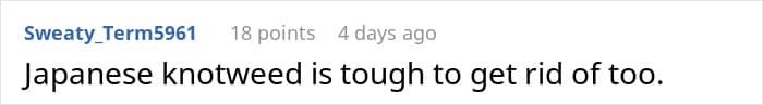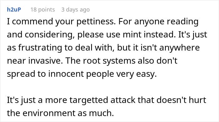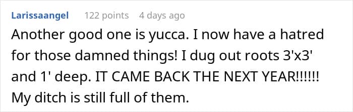 Others suggested other equally annoying plants, like yucca or the Japanese knotweed. Though, depending on where OP lives, this sort of deal can be considered an environmental crime, so caution was advised.