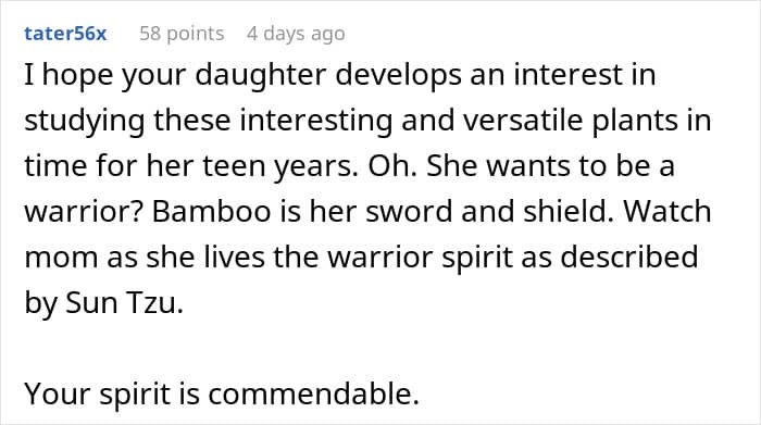 In response, OP decided to to something quite devious. So devious, in fact, that it would take roughly 5 years to fulfill. As of this article, she’s 3 years in with only 2 to go. Well, OK, “only”. It’s a long time to wait, honestly. But you can’t rush bamboo.
