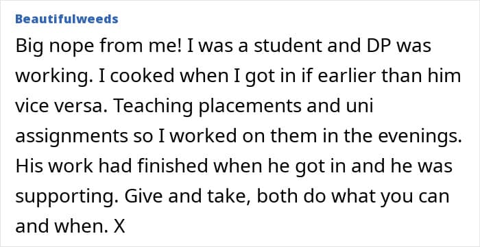 But not every couple will be able to find a solution to this issue. “If someone refuses to help even when their partner is struggling, it’s a red flag,” the expert shared. “People can change, but only if they genuinely want to. In this case, there’s no real willingness to support or compromise. That’s not just a cooking issue—it’s a respect issue. If someone won’t step up now, they’re unlikely to do so in the future, especially when bigger responsibilities come along.”