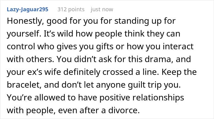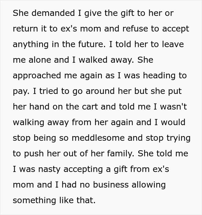 OP was touched by it, but little did she know what it would lead to. For starters, the ex’s new wife was less than okay with it – she confronted the poster and started cursing loudly, asking for the gift and demanding that she never accept anything from the mother-in-lawagain.