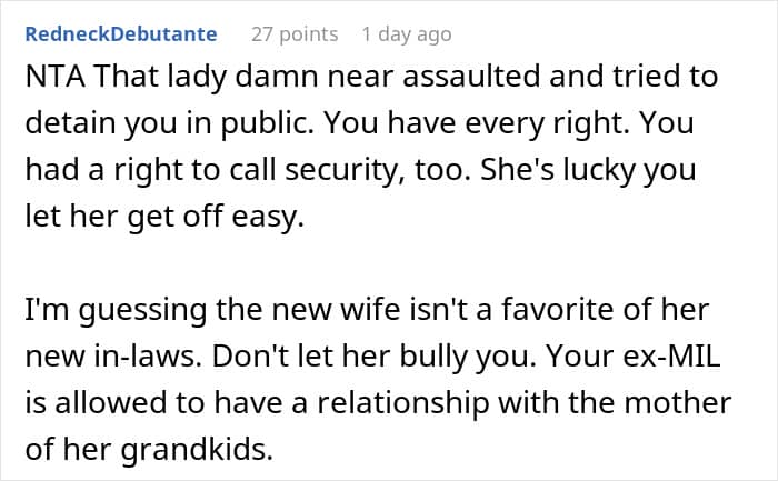 For instance, the original poster’s (OP) ex’s new wife doesn’t know where to draw a line as she went ballistic when the poster received a gift from her ex’s mom. In fact, the new wife confronted her in public, which resulted in quite a drama!