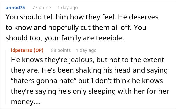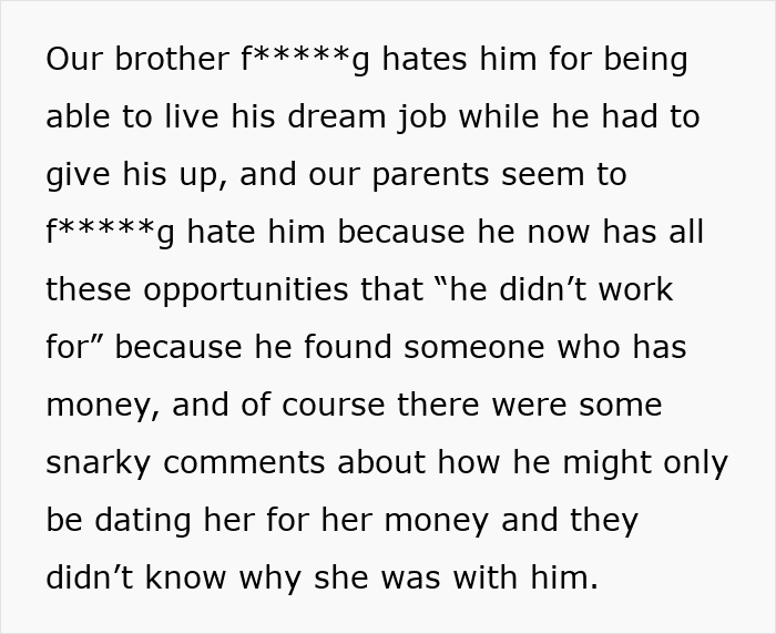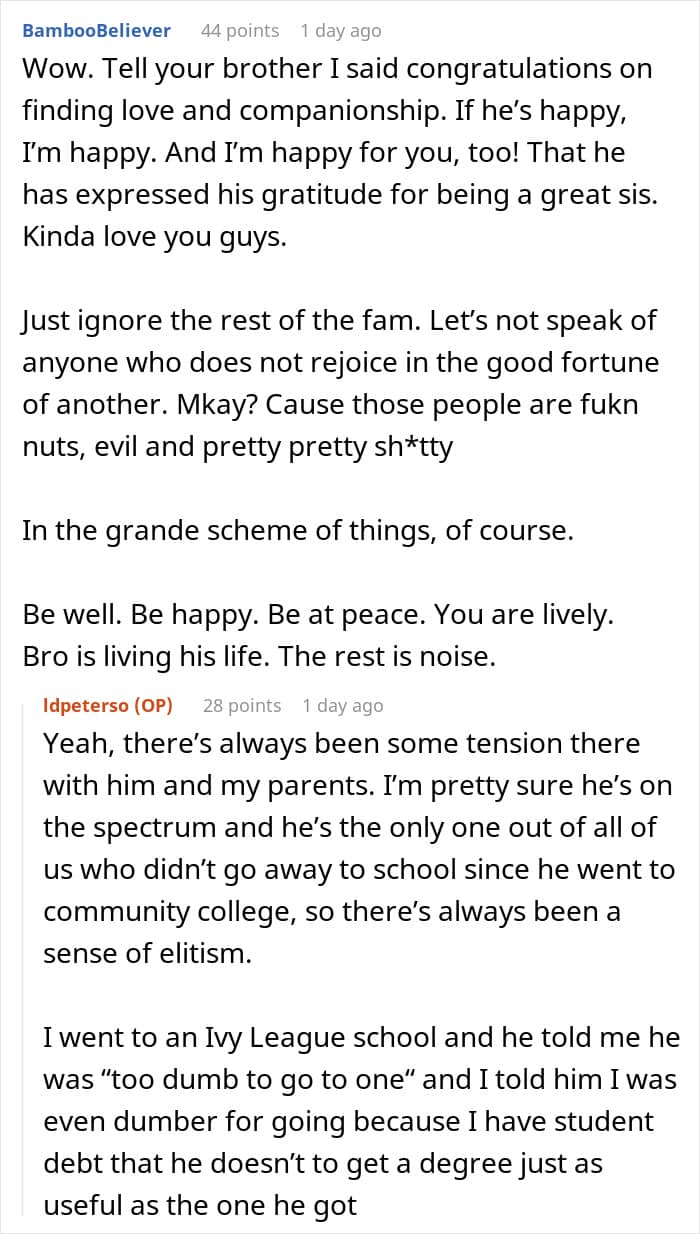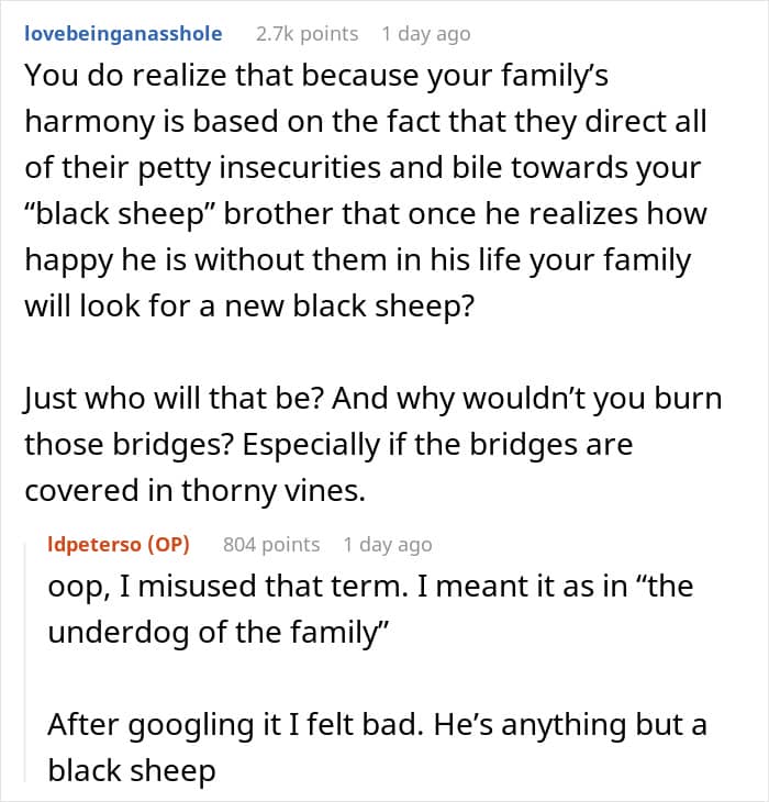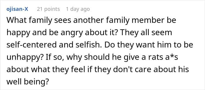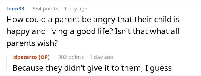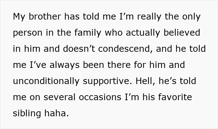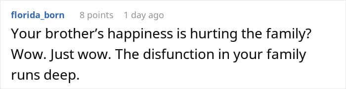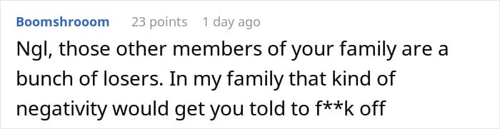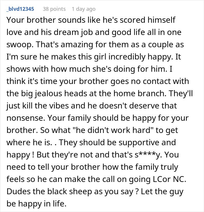 It’s unclear if the OP’s parents felt resentment towards their son because he didn’t have to do certain things as a child that they might have had to – in her post, the woman noted that they felt negative emotions towards him because he had all sorts of opportunities that “he didn’t work for.” But no matter the reason for their resentment, the family’s views made the OP uncomfortable, as she was torn between standing up for her brother and not wanting to burn bridges between her siblings and parents over it. Fellow netizens in the comments, though, seemed to have clearly taken one side over the other.