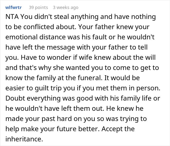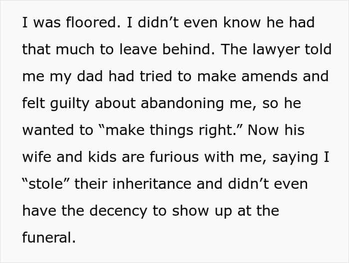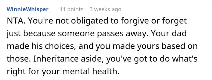 This Redditor’s father abandoned her and her mom when she was just 10 years old, making little effort to be in her life after that. So when she became an adult, she chose to distance herself completely, and by the time he passed away, she felt no need to attend his funeral.
