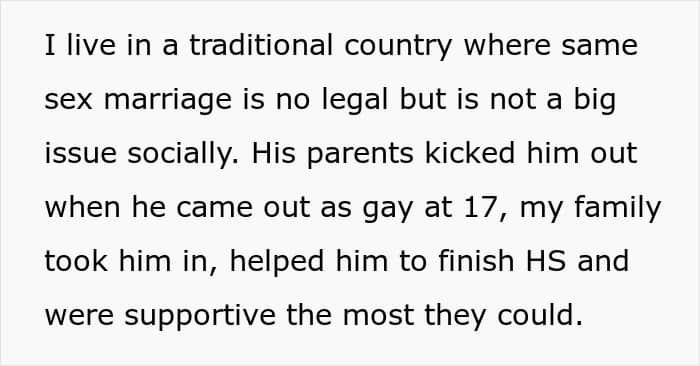 The thing is that the author and his partner studied together in high school, and when the guy was 17, he came out as gay. But his traditional family, in response, abandoned him. In turn, the OP’s parents always supported the couple. Both emotionally and financially. And then the partners themselves began to earn decent money.