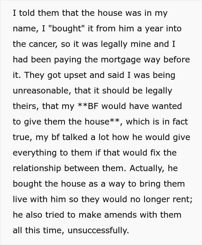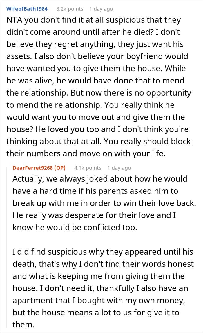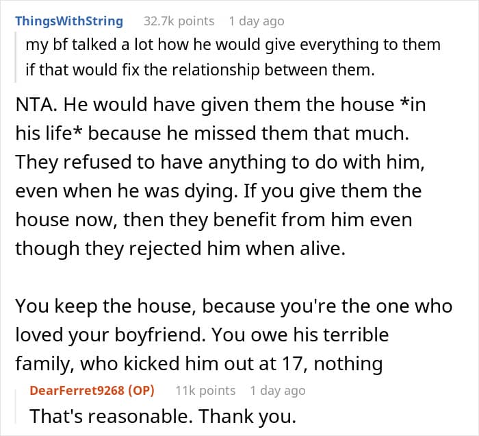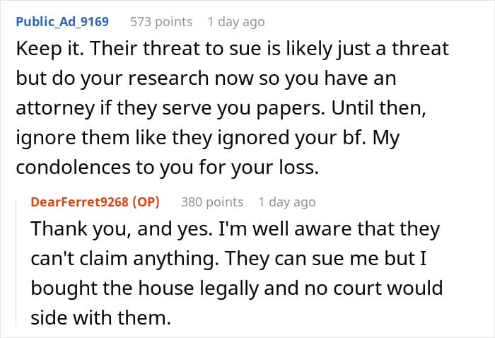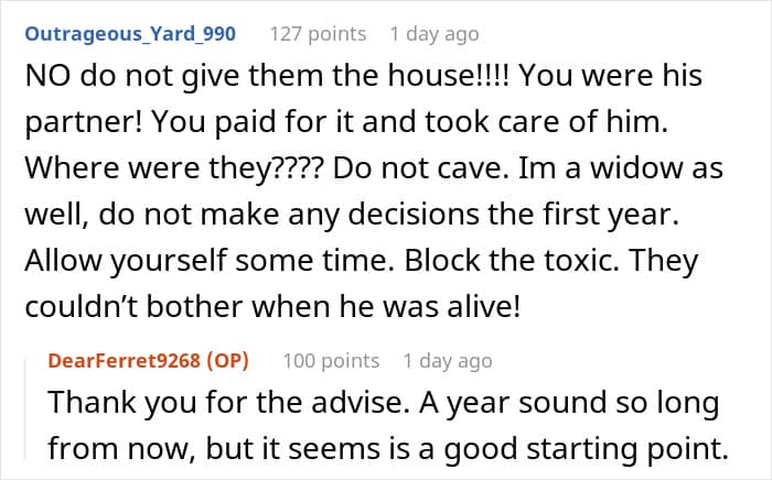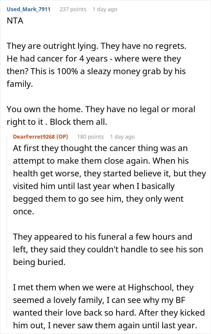 People in the comments are also convinced that the author shouldn’t make any concessions to people who for many years didn’t want to have anything to do with his partner. And with himself too. “BF tried to make amends several times. He was blown off each time. Now that there are no amends to be made, they try to profit of his death. It’s glaringly obvious. Now suddenly they care. Great for them,” one responder reasonably wrote. “Do not give them the house.”