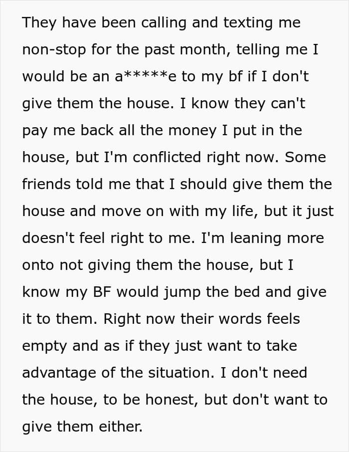 The result was a real scandal, and the author got labeled selfish and mercantile. Moreover, he was threatened with a lawsuit over the house – but here the OP is nearly sure that this will not work. In general, he doesn’t need this house at all – but it’s a pity for the money that he has already invested in it.