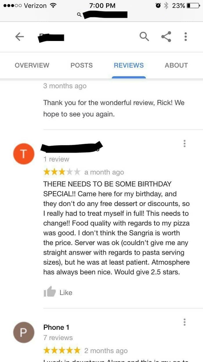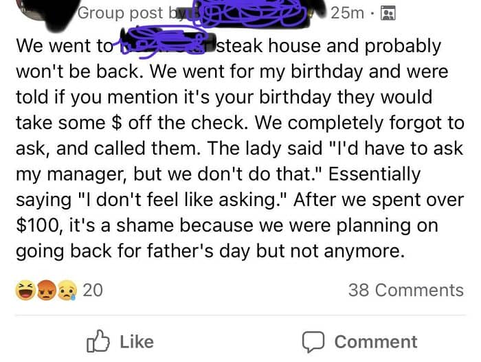 #54 How Dare This Privately Owned Local Restaurant Force This Man To Pay For His Entire Birthday Meal.. In Full! They Probably Didn’t Sing To Him Either! Unacceptable