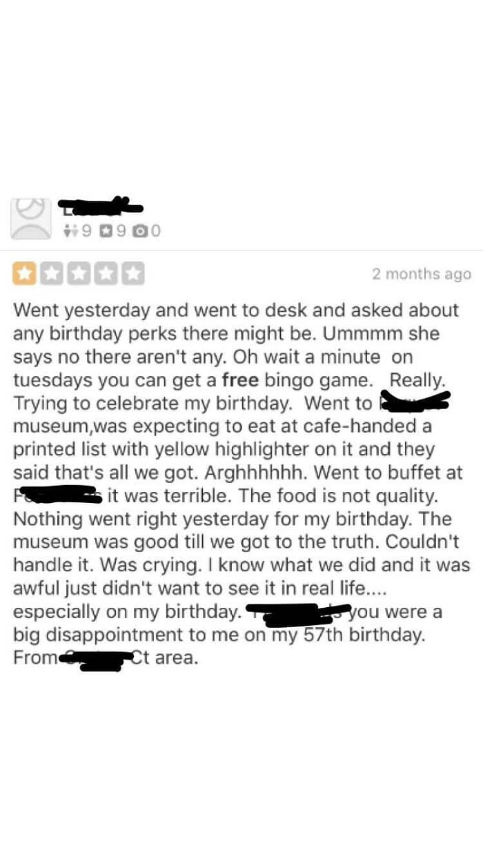 #43 Lady Asks For Free Birthday Perks At Casino And Didn’t Like The Option.goes To 2 Worst Places To Eat Out Of Hundreds Of Places There-Didn’t Like The Options. Goes To The Native American Museum And Feels Her Birthdays Ruined When She Sees How Natives Were Treated- But She Knew The History. Can’t Win