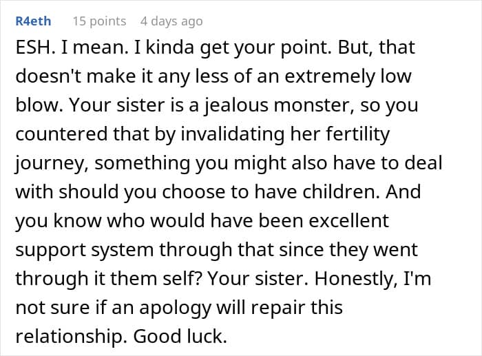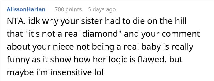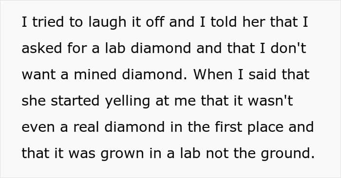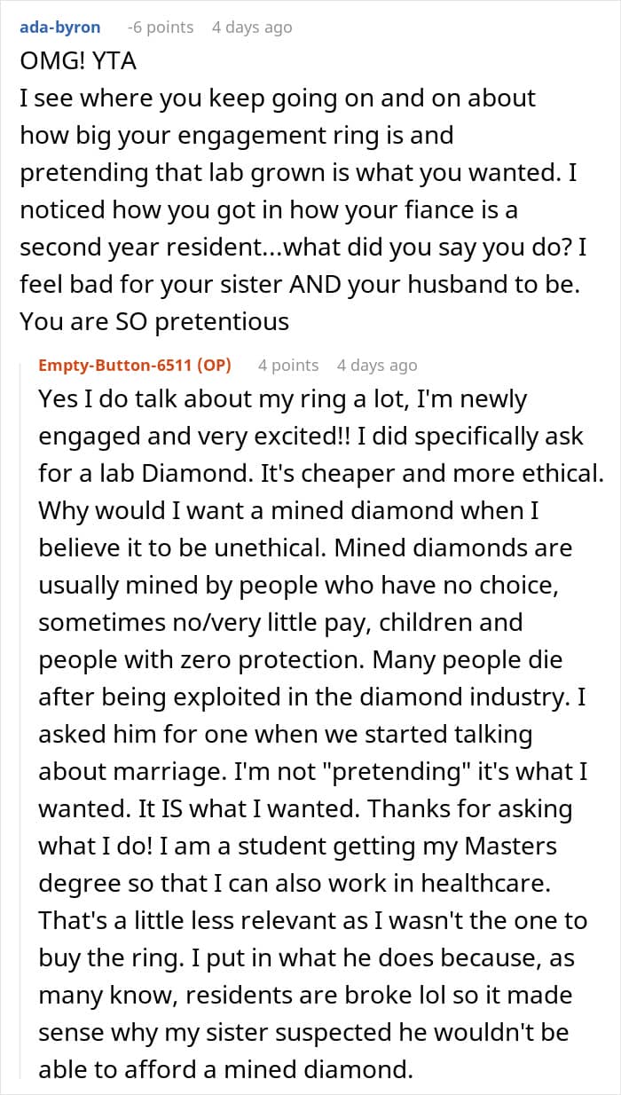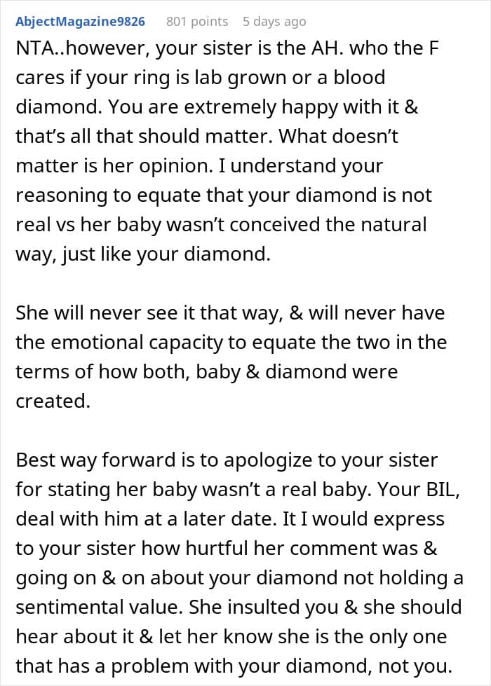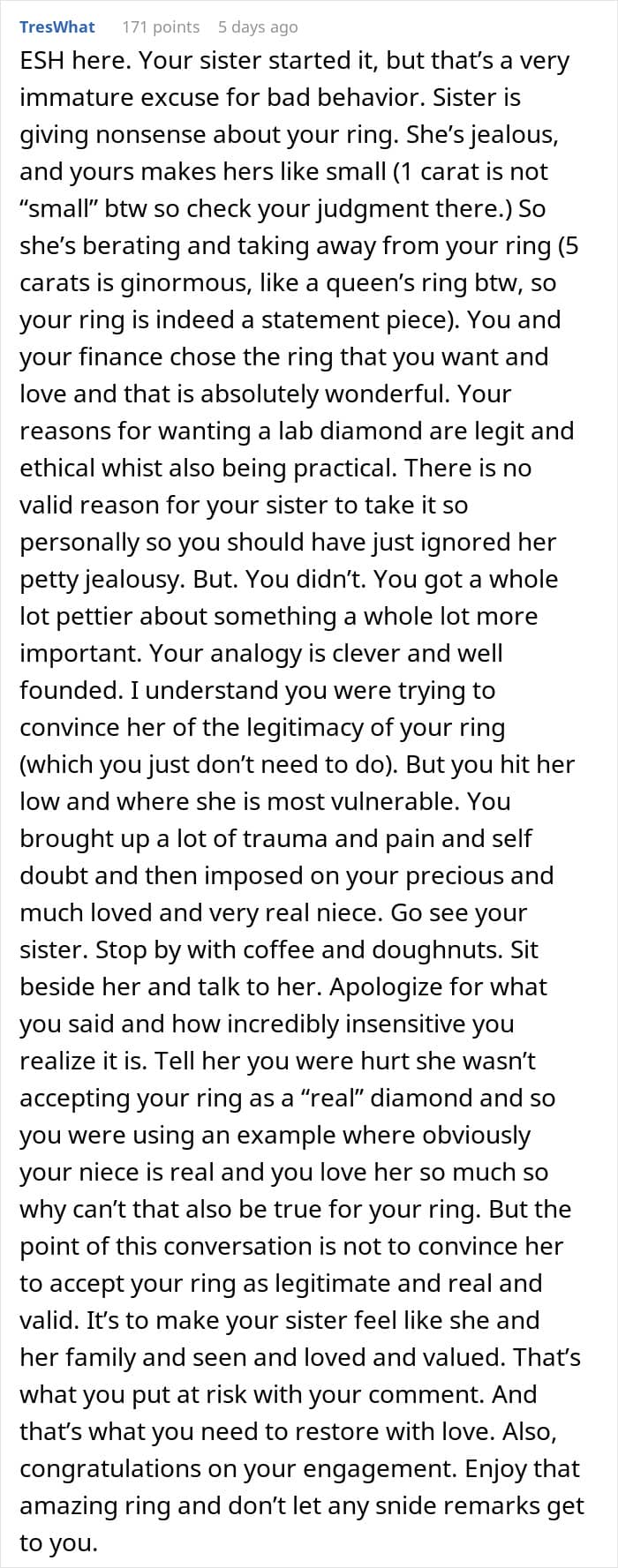 Like this woman, who, after telling her sister about her engagement, instead of receiving cheerful congratulations, got accused of her lab-grown diamond ring being fake. Such a comment majorly upset her and she didn’t even notice how an insult about her sister’s baby flew out of her mouth, causing a whole situation.