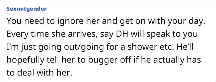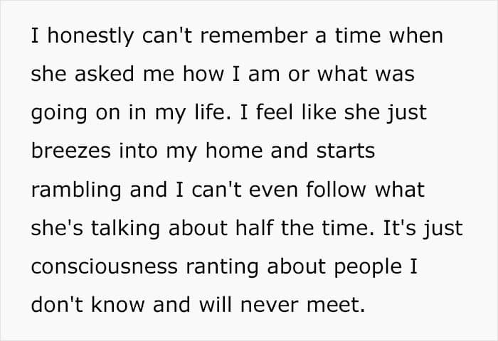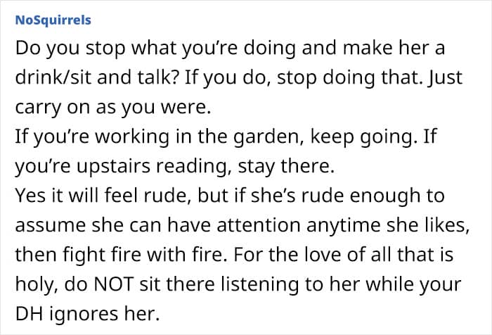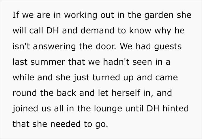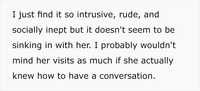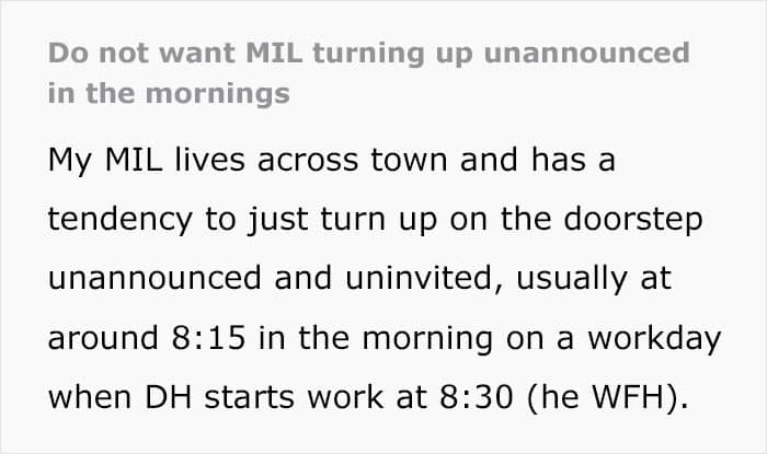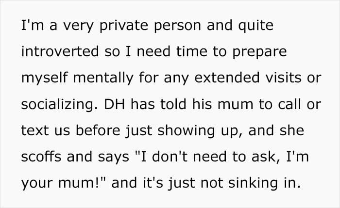 “My MIL lives across town and has a tendency to just turn up on the doorstep unannounced and uninvited,” she wrote. Being “a very private person and quite introverted,” the woman explained that she needs time to prepare herself mentally for any extended visits or socializing. But her MIL clearly doesn’t see that.