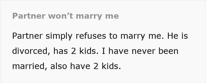 In today’s story, our protagonist laments about her partner of 5 years who simply refuses to marry her as he only wanted to marry once, which didn’t work out. He even refuses to make any financial commitment to her, like buying a house, as he wants his estate to befall just his kids when he passes away.