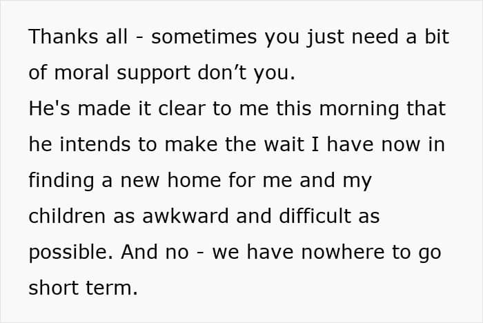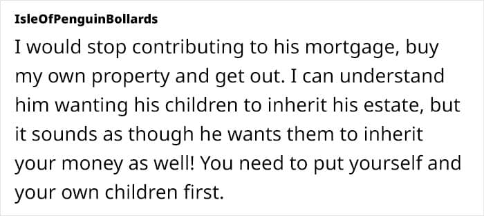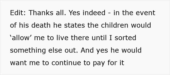 The poster also informs us that she helps him with his mortgage, funds their trips, does all the housework, and ensures he returns home to a clean house as she works from home. In return, he said that he would not leave her anything when he passed away, even if it might make her homeless, but give his entire inheritance to his kids.