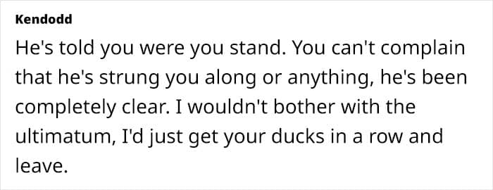 This is evident as we see the poster giving an ultimatum to her partner, which many people online said was not a good idea. Despite the ultimatum, she found out how little the guy cared about her as he prioritized his kids and finances over her.