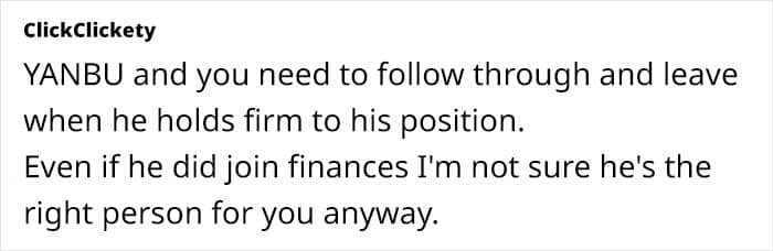 Although they agreed with OP regarding the financial part, they said that she shouldn’t have expected him to change when he had decided beforehand. They felt that it was unreasonable of her to give him an ultimatum over it.