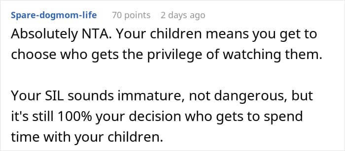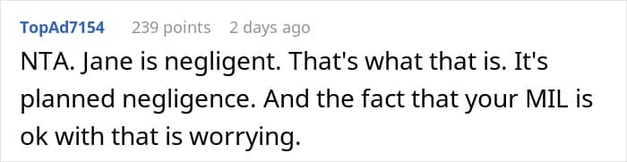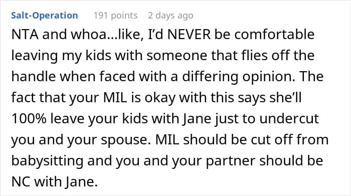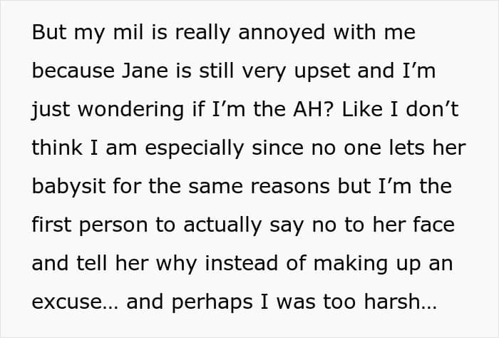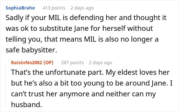 We were able to have a short chat with u/RaisinNo2082 via Reddit messages. She tells us that her mother-in-law finally took her side. “My MIL has finally come around,” the OP says. “My husband’s other siblings also told her that they don’t let Jane babysit for the same reasons, and she kind of got this reality check. My MIL apologized.”