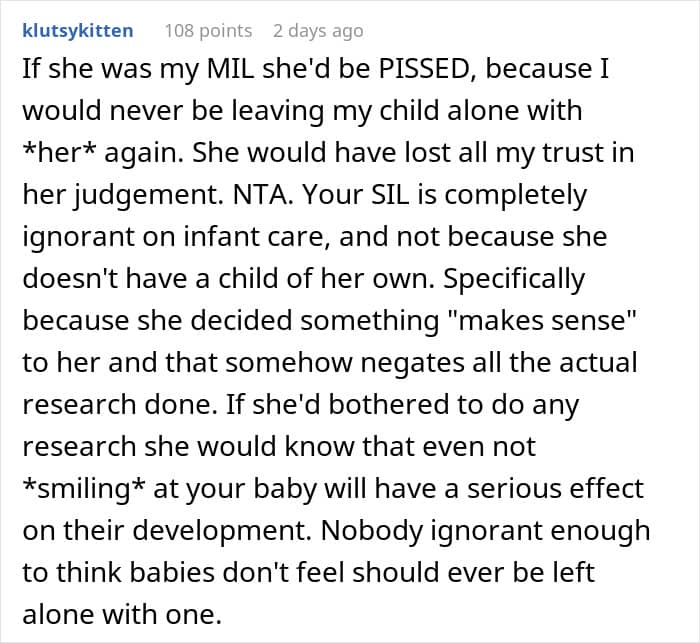 This mother refused to leave her baby with her SIL. Mostly because the youngster said she didn’t believe babies could feel anything at that stage. She did, interestingly, get offended when the parents refused her the babysitting job. Not sure whether she was too harsh, the mother decided to check in with the Internet.