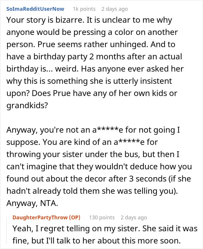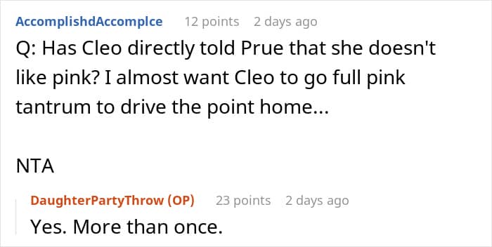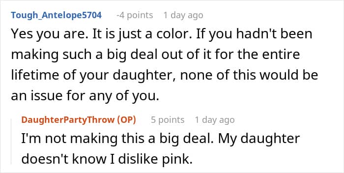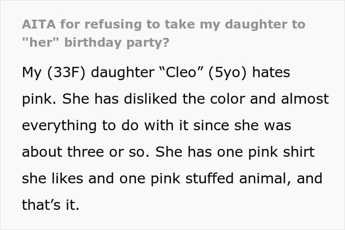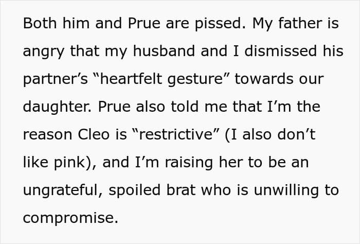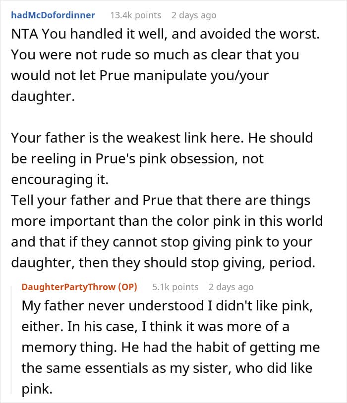 This Redditor’s 5-year-old daughter has made it clear she’s not a fan of the color. Her grandad’s partner, however, simply refuses to accept it. In her latest attempt to “fix” the child’s taste, she planned a surprise pink-themed party—where every inch of the space, from the balloons to the tableware, looked like it had been dipped in strawberry frosting and bubblegum.