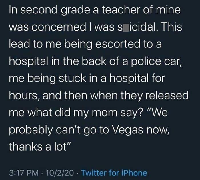 #21 This Was By Far The Worst Incident. I Was In 2nd Grade, 7-8 Years Old And Just Went Through Some Of The Worst Trauma Of My Life And My Mom Was More Worried About Going To Vegas Then My Health
