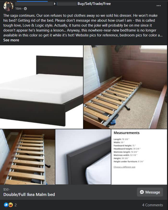 The saga continues. Our son refuses to put clothes away so we sold his dresser. He won't make his bed? Getting rid of the bed. Please don't message me about how cruel I am this is called tough love, Love & Logic style. Actually, it turns out the joke will probably be on me since it doesn't appear he's learning a lesson… Anyway, this nowhere-near-new bedframe is no longer available in this color so get it while it's hot! Website pics for reference, bedroom pics for color.
