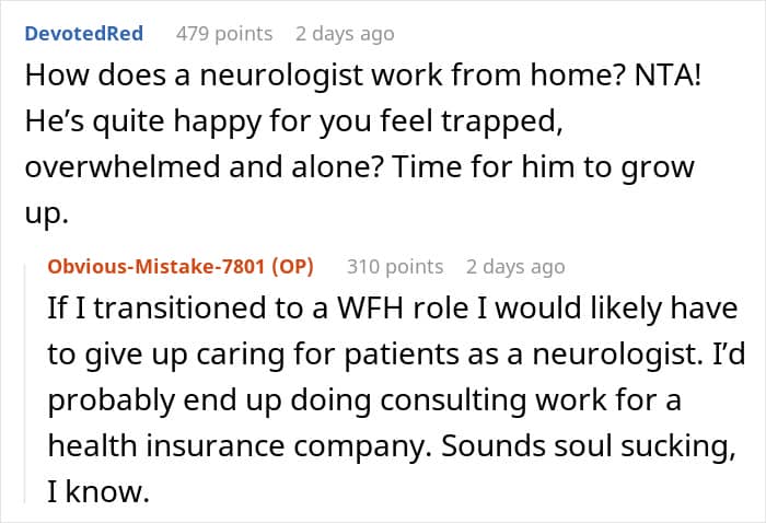 Internet user u/Obvious-Mistake-7801, a new mom and neurologist, asked the internet for advice after a huge argument at home. She shared how she lashed out at her husband after he suggested going back on his promise to be a stay-at-home dad. Scroll down to read the full story and to see how the r/AITAH community interpreted the situation. We has reached out to the author, and we’ll update the article as soon as we hear back from her.