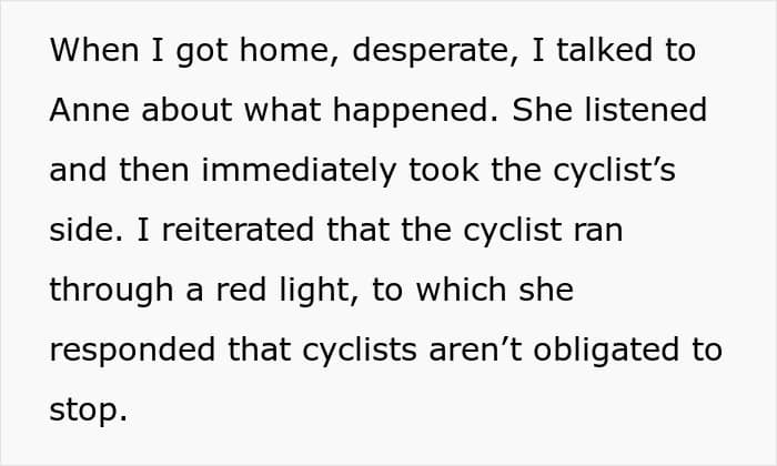 So, our guy went home, desperate for some comfort, and shared the whole ordeal with Anne. Now, at this point, you’d think a loving spouse would say something like “Wow, that’s terrible! Are you okay?” But no. Not Anne. She actually jumped to defend the cyclist. According to her, red lights don’t even apply to bikes. Sure, the guy may have missed a red light, but Anne’s countless red flags can be spotted from the moon.