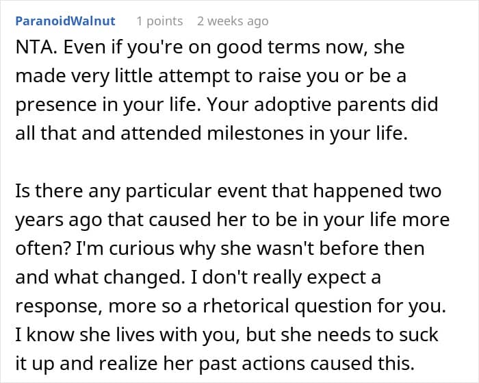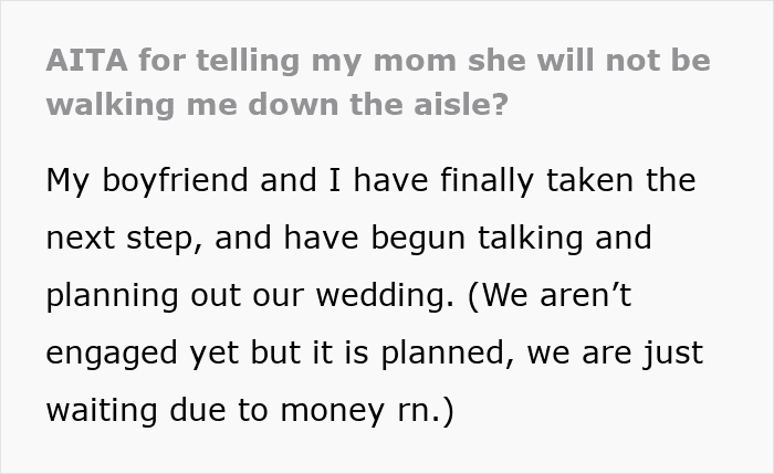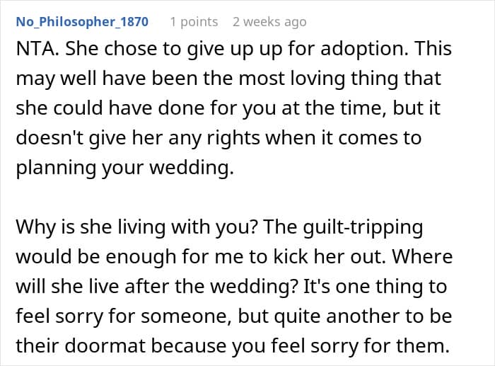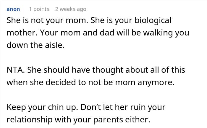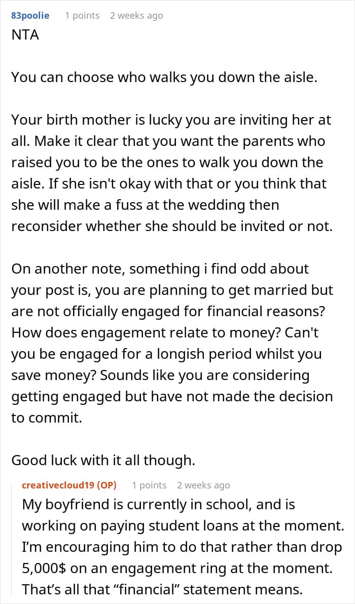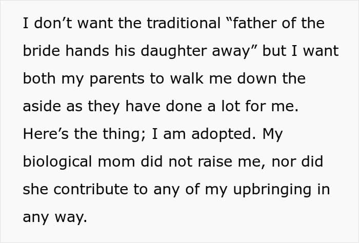 However, in a recent Reddit post, Creativecloud19 shared a difficult dilemma she faced while planning her big day. The bride wanted her adoptive parents to walk her down the aisle, but her biological mother, who has recently re-entered her life after years of estrangement, feels deeply hurt by the decision.