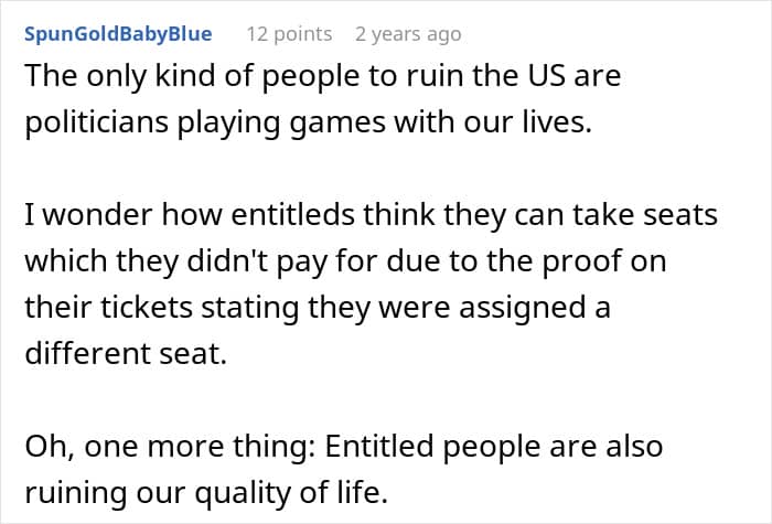 It’s arguably safe to assume that the OP would add “being rude to other passengers” to the list of annoying things people on planes do, as even though the entitled woman was eventually removed from the seat the redditor paid for, she didn’t leave without making a comment first. Well, fellow netizens had comments in regards to her behavior, too.