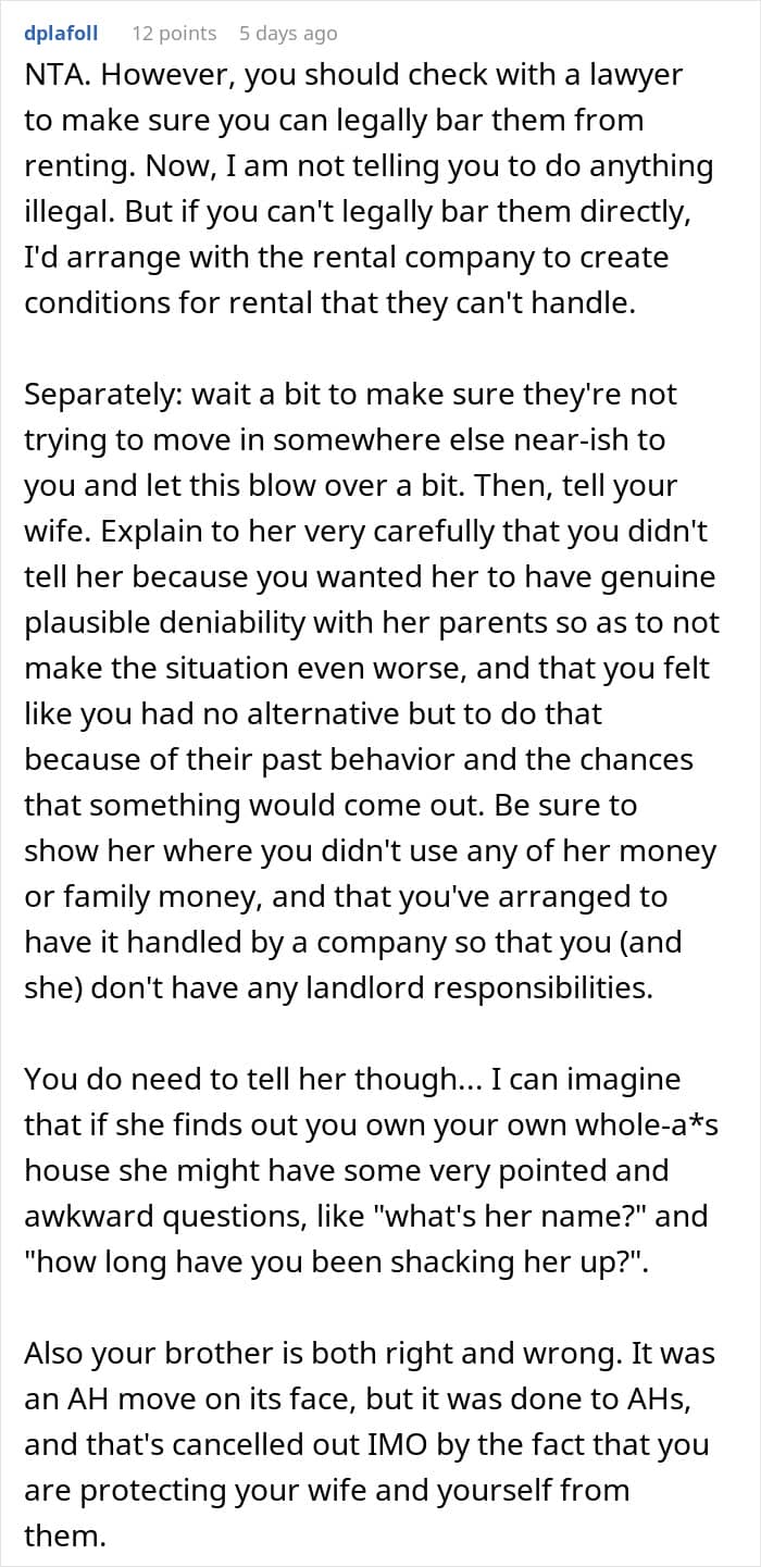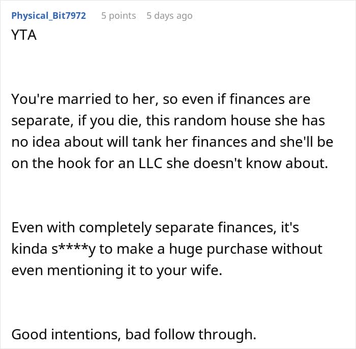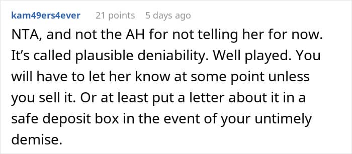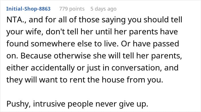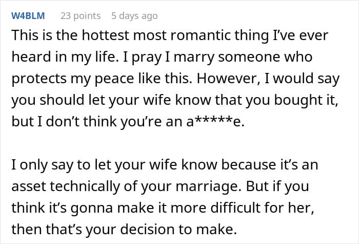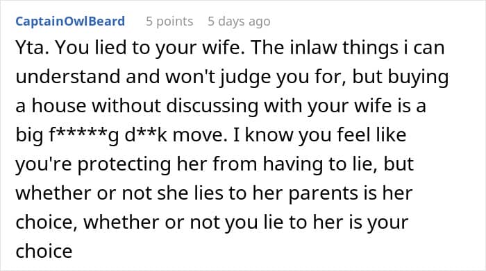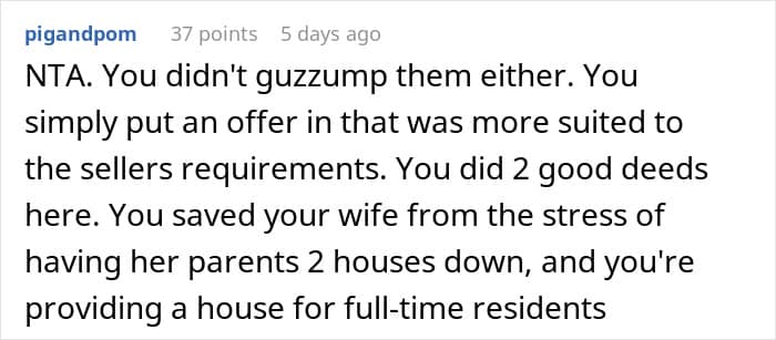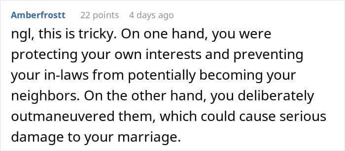 However, it’s fair to say that most people would probably not be able to pull off this strategy. The real issue isn’t if this person was wrong to outbid their in-laws, that’s their prerogative, it’s that they should ultimately talk to their wife about it. Secrets, even if well intentioned, don’t really help strengthen a relationship.