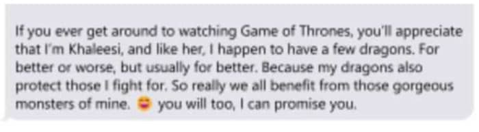 “If you ever get around to watching Game of Thrones, you’ll appreciate that I’m Khaleesi, and like her, I happen to have a few dragons,” the actress allegedly wrote, according to Baldoni’s complaint.