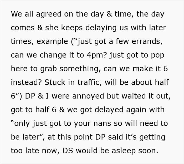 Her mother-in-law picked the time and date, forcing her son to exchange shifts with somebody at work so he could be available. Well, the day came, and the mother-in-law kept delaying their appointment until her son called to let her know that it was unlikely they’d meet at all as his son was going to bed soon.