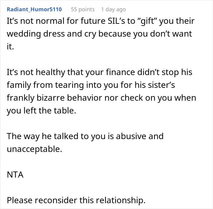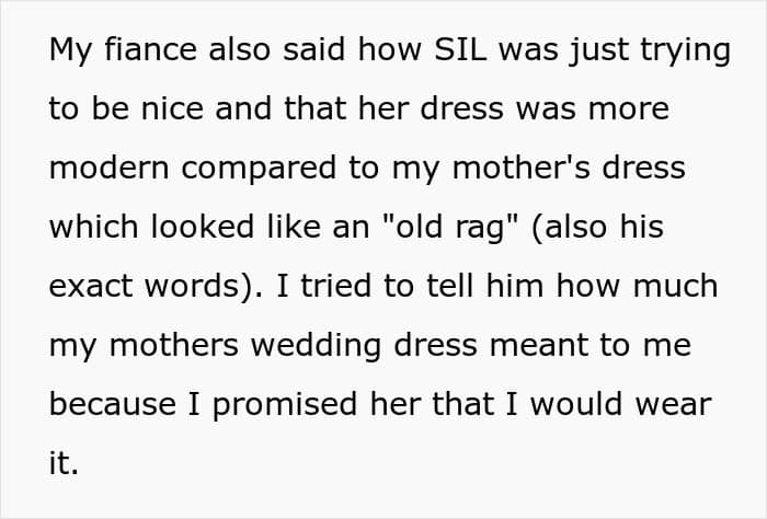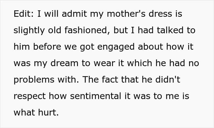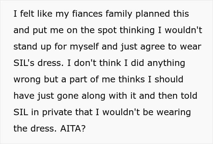 In her candid post, the woman explained that her future in-laws started insisting on the couple making changes to their wedding, and everything culminated in them pressuring her to wear another dress. One they had picked for her.