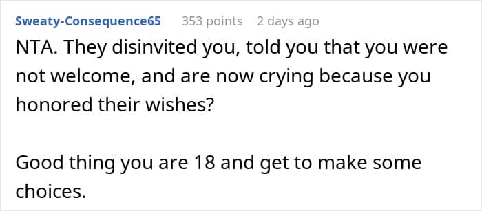 Readers assured the teen that she had done nothing wrong, while many called out her father for excluding her