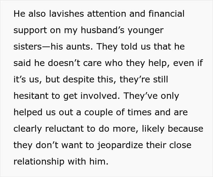 OP goes on to say that their son has what she calls “a peculiar tendency” to spoil all the women he considers family, most pointedly his dad’s younger sisters, upon whom he lavishes attention and financial support. The sisters have helped out OP and her husband from time to time, but OP thinks they’re hesitant to do more in case they jeopardize their close relationship with OP’s son.