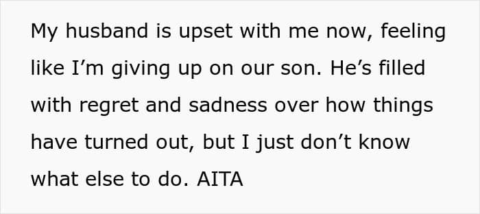OP concludes her post by sharing that her husband is upset with her and has accused her of giving up on their son, but she doesn’t know what else to do, and wonders if she’s the jerk in the family drama.