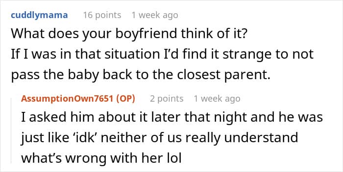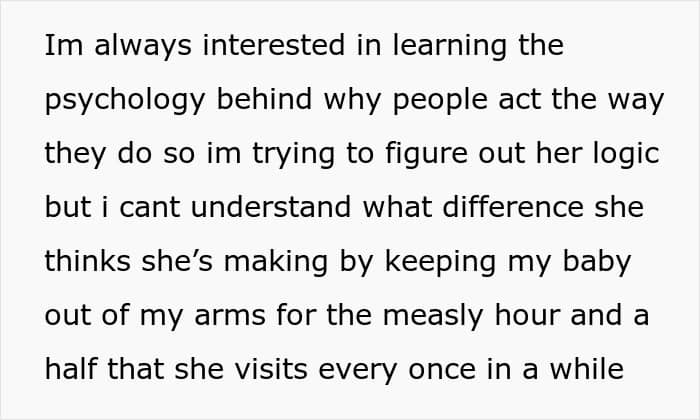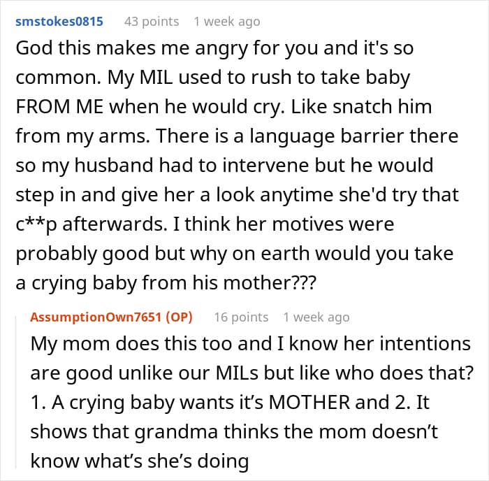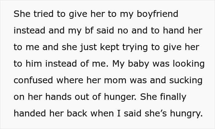 The author was sitting on the couch next to her MIL, but she again wouldn’t give her the baby—and only when the original poster directly stated that the baby was hungry, she handed her over… but, as you can guess, again into the hands of her son! And he, also quite surprised by such behavior, handed the daughter to her mom.