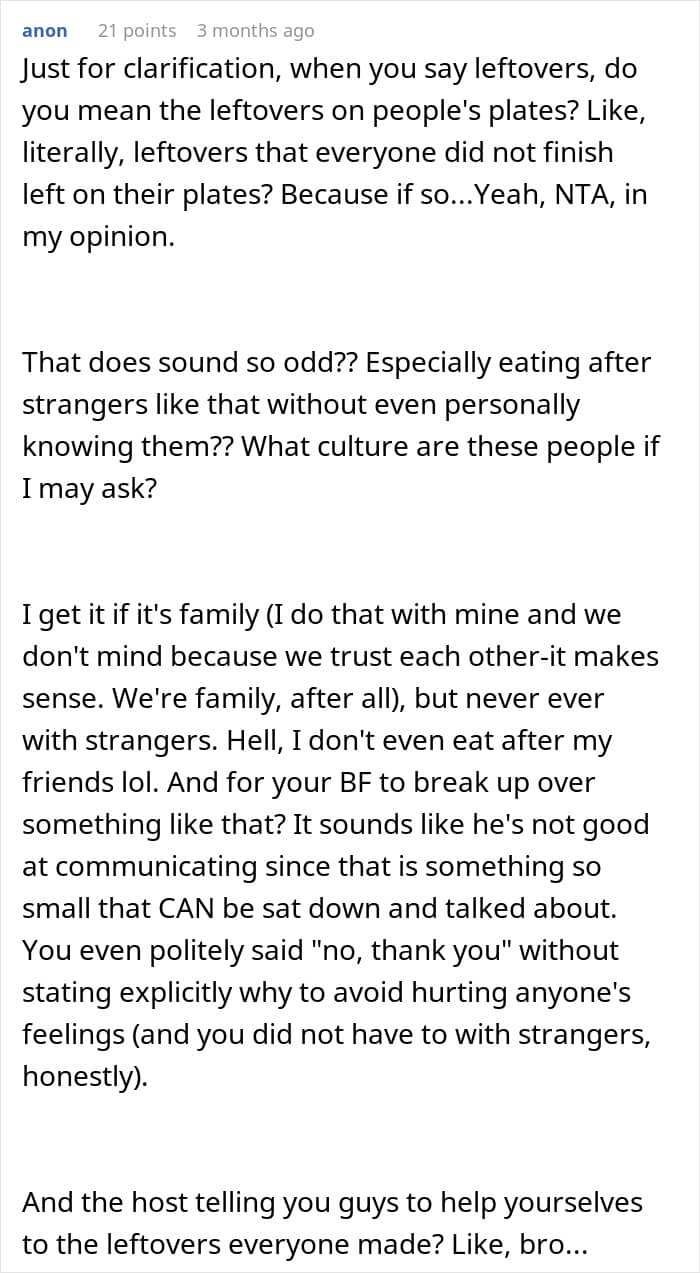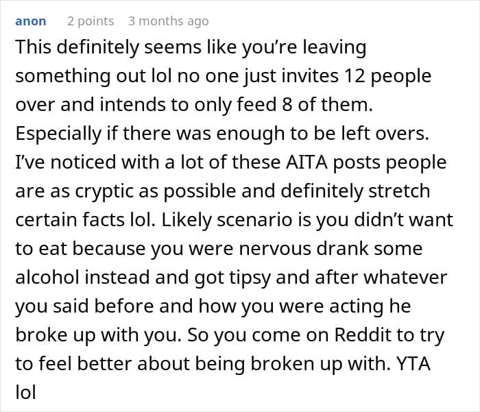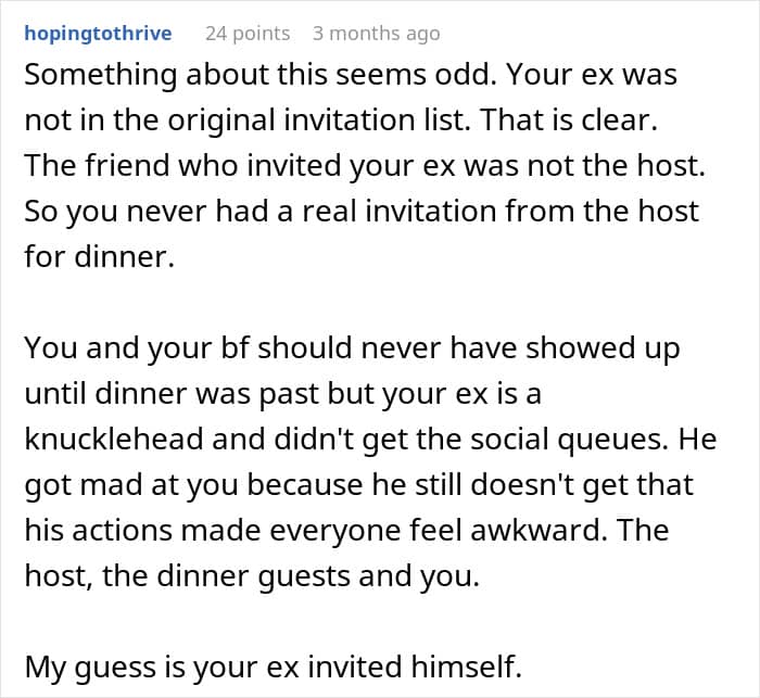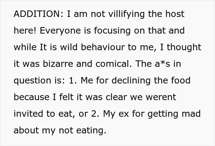 Summing up the awkward experience, the OP admitted that they should have never gone to the host’s house during dinner. The friend—that was one of the expected guests—shouldn’t have invited them to join, in the first place. “It was so weird, but also, I would never not feed people and make them watch me eat no matter the circumstance,” she added. “All of these people were in the wrong in my opinion – the host, the guest who invited us, the friends who showed up during dinner uninvited, and my ex-boyfriend for eating the food after the host blatantly pretended we weren’t there during dinner. If I knew we were crashing a dinner party, I would have never gone.”