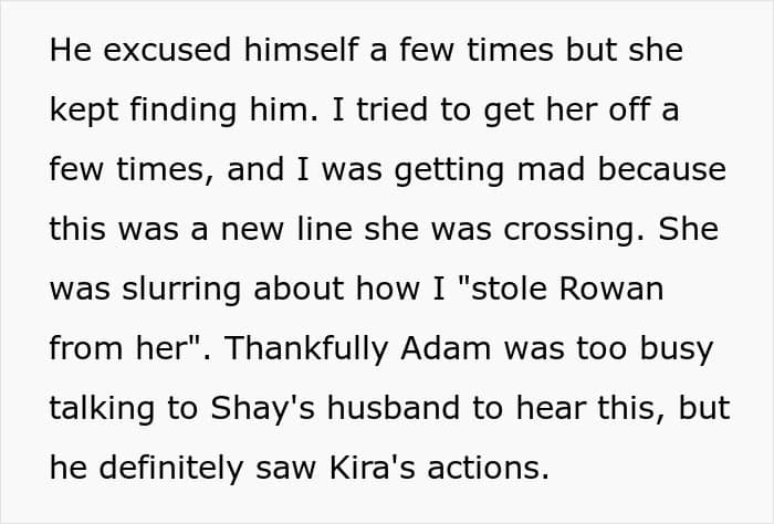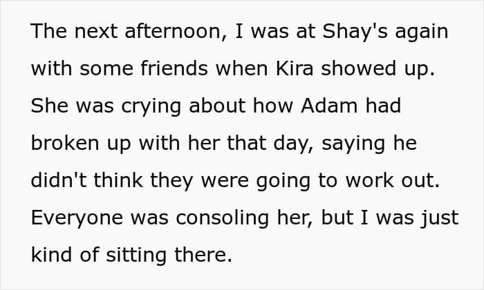 The morning after, Kira showed up at a mutual friend’s house in tears after Adam had broken up with her. While the room filled with sympathetic sighs and comforting pats, Ava was silent. When Kira turned to her, expecting some tearful support, Ava blurted out this gem: “Maybe Adam wouldn’t have left you if you weren’t trying to get with Rowan all the time.”