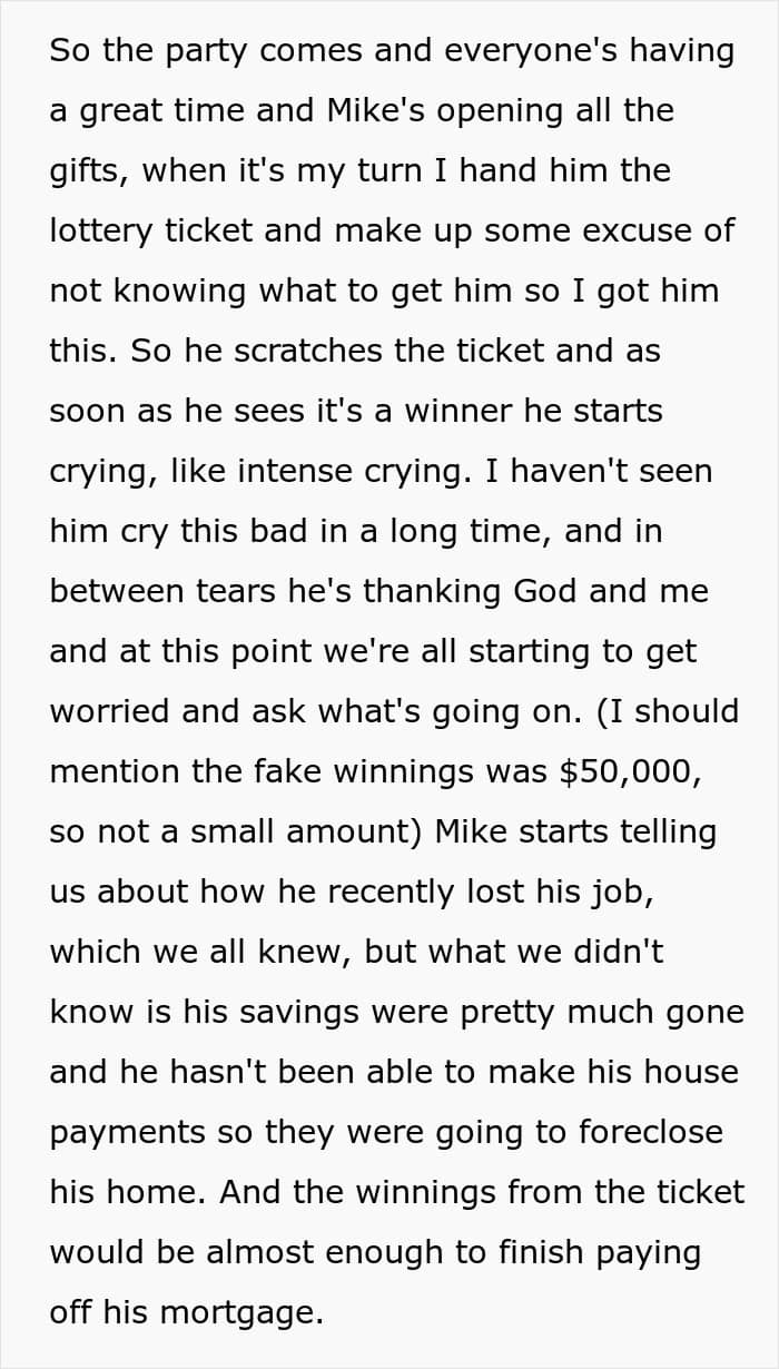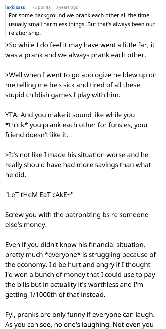 Speaking of pranks, some people go really far, just like Reddit user iamathrowaway536 who gave a fake lottery ticket worth $50,000 to his friend who was financially struggling. When he found out it was just a prank, he got upset and said he never wanted to see the original poster (OP) again!