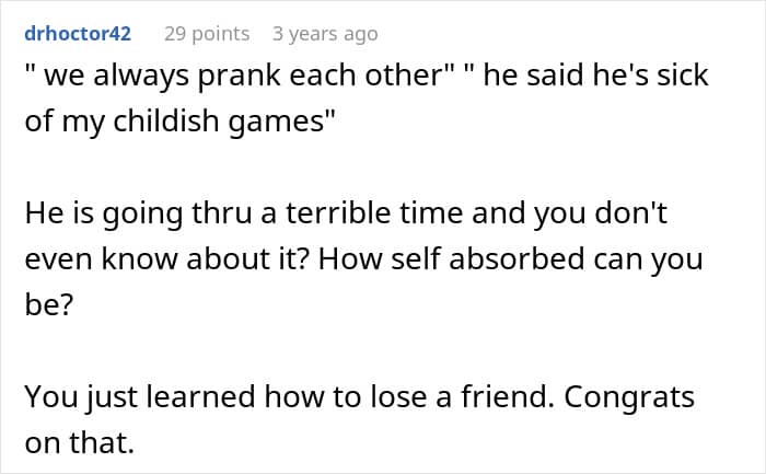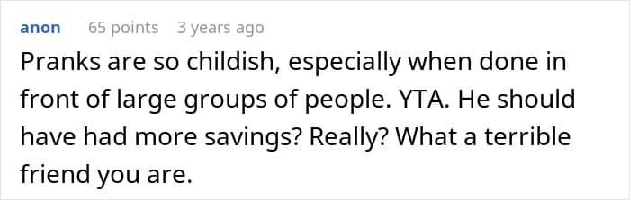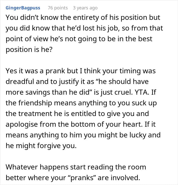 Folks also found it very condescending of OP when he said that Mike should’ve had more savings. They also mentioned that from what Mike said about finding the pranks childish, it didn’t look like they pranked each other, more like OP kept pranking him.