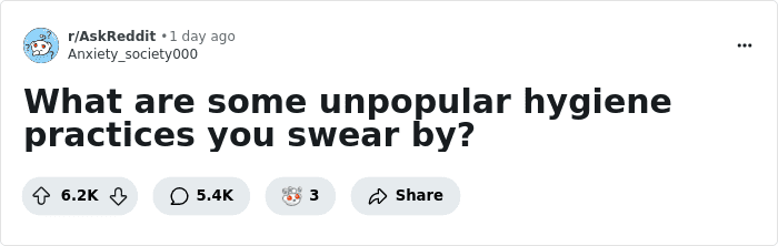 Here, for instance, this Reddit thread about unpopular hygiene practices is useful for everyone, even if you think you’ve got it together. It was posted as the question on r/AskReddit and within a few days nearly 6K provided their input.