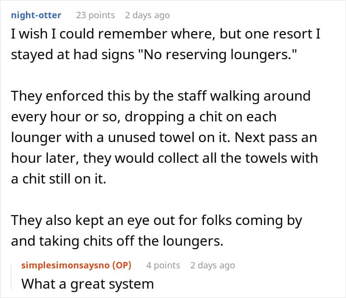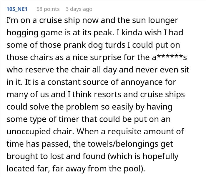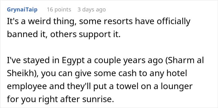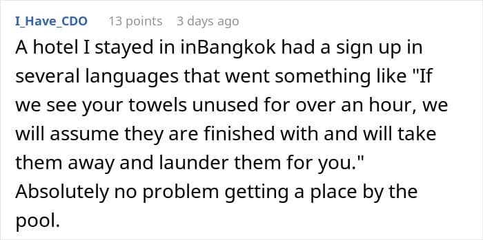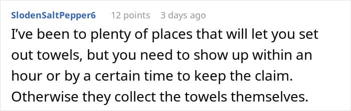 A man experienced a similar incident, but his experience involved a few “selfish” guest patrons at an island resort. According to his account, the guests used their towels to reserve not one, not two, but seven sun loungers.